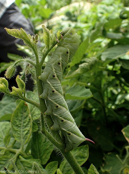 - Larve d’assez grande taille atteingnant jusqu’à 5 cm. Elle possède 5 paires de fausses pattes et une "corne" à l’extrémité de son abdomen. Cinq stades larvaires se succèdent en 20 jours.