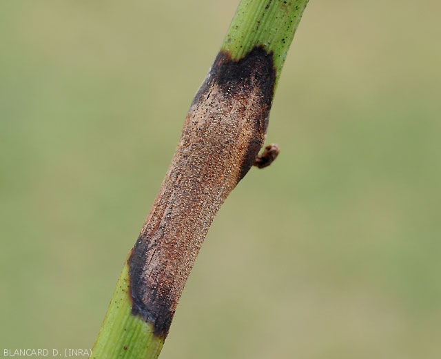 - Les lésions sur pédicelles et rameaux sont plus ou moins allongées et déprimées, de teinte brunâtre ; les tissus affectés situés en périphérie sont brun foncé à noirâtres (figures 10 à 17). Les altérations peuvent aussi être chancreuses, cernées de bourrelets de tissus cicatriciels entrainant un éclatement de l'écorce en lanières plutôt caractéristiques (figures 10, 11, 15 et 16). Notons que les altérations sur pousses vertes sont localisées autour des noeuds (figures 12, 13 et 16).