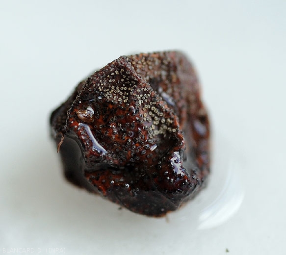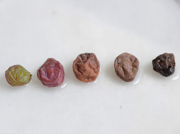 - Les symptômes sur baies se manifestent avant et après la véraison. Avant véraison, les baies prennent une teinte livide, beige rosé à beige violacé ; le phénomène affecte entièrement les baies qui flétrissent progressivement (figures 1 à 6). Des petites protubérances apparaissent à la surface des baies : des pycnides du champignon (figures 7 à 9 et 17). Assez rapidement, les baies se ratatinent et se dessèchent (figures 2 à 8). Certaines d'entre-elles tombent au sol alors que d'autres restent solidaires de la rafle (figure 4). La coloration blanchâtre des baies est due à un décolement de la pellicule des tissus épidermiques consécutif au parasitisme de P. diplodiella. Ce champignon peut aussi gagner les pédicelles et ensuite envahir la rafle, entrainant parfois un flétrissement et un dessèchement partielle de la grappe (figure 3).