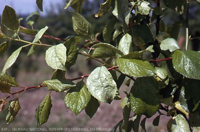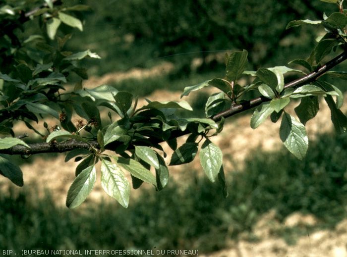 Le feuillage de l’arbre prend une teinte vert pâle, métallique, terne. Les feuilles présentent un aspect argenté, plombé. Au début, les symptômes sont localisés et ne concernent qu’une partie de l’arbre. Les branches et les rameaux contaminés ont une croissance ralentie avec un port buissonnant. L’évolution de la maladie est plus ou moins rapide. Elle peut aboutir à la mort de l'arbre en quelques années. Sur certaines variétés sensibles (ex : Tardicotes), il peut y avoir une phase de rémission en automne.