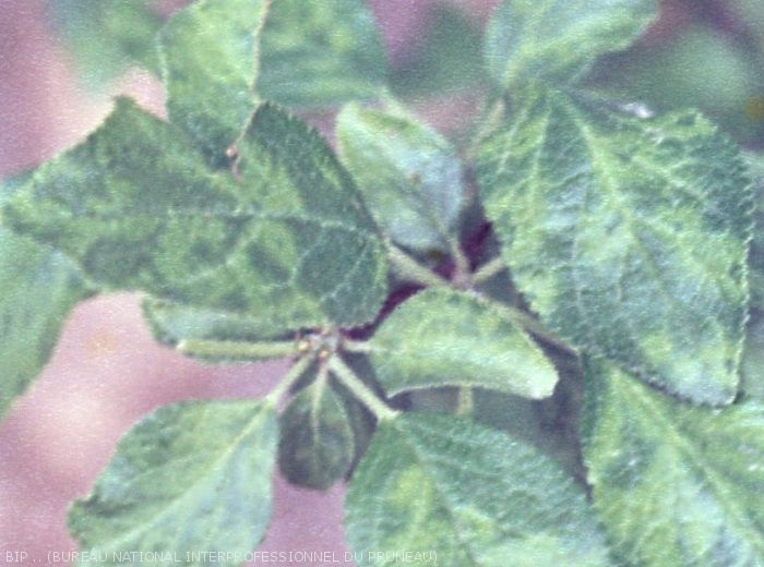 - transmission par les pucerons (sur prunier d’Ente, principalement Brachycaudus helichrysi). Il s'agit d'une transmission en mode "non persistant". Lorsque le puceron pique une plante contaminée, il "acquiert" le virus dans ses pièces buccales. Lorsqu'il se déplace sur un végétal sain pour s'alimenter, il transmet le virus. Les arbres sont ainsi contaminés de proche en proche, à faible distance. Le risque d'infestation d'une parcelle augmente, si des vergers contigüs sont concernés par la maladie. 95 à 99% des transmissions se produiraient à moins de 200 mètres du foyer de contamination. Chaque plante contaminée constitue un réservoir de virus : la propagation de la maladie est donc fortement réduite par leur identification et leur destruction précoces.