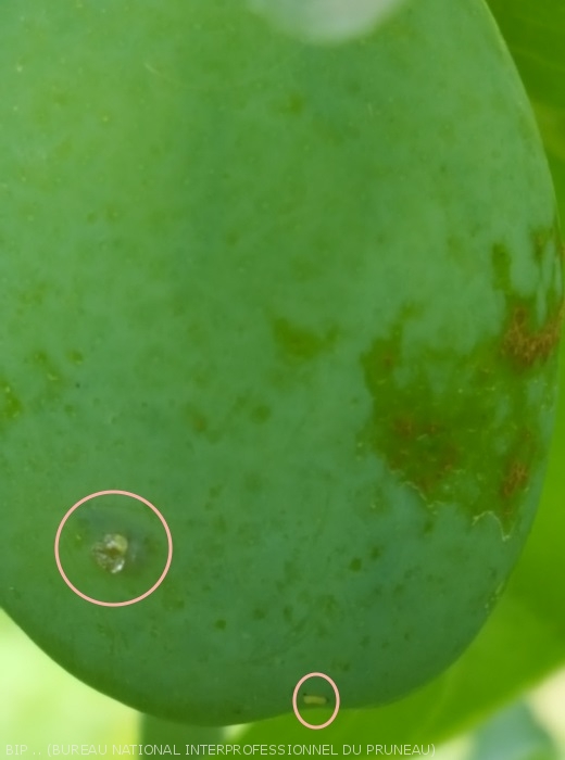 Les fruits attaqués présentent des perforations en forme de spirale. Des écoulements gommeux caractéristiques peuvent alors être observés. Ils correspondent à une défense naturelle des fruits. Avec un peu d'attention, et à l'aide d'une loupe, il est possible d'observer une ou des traces d'oeufs à proximité de la perforation.