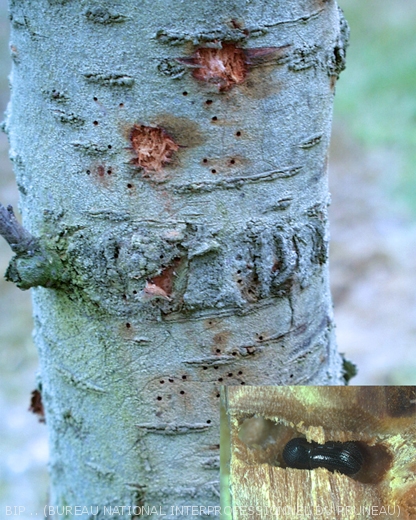 Présence de trous sur l'écorce. Les scolytes creusent des galeries superficielles sous l'écorce. Les galeries de xylébores sont plus profondes, avec présence de sciure.