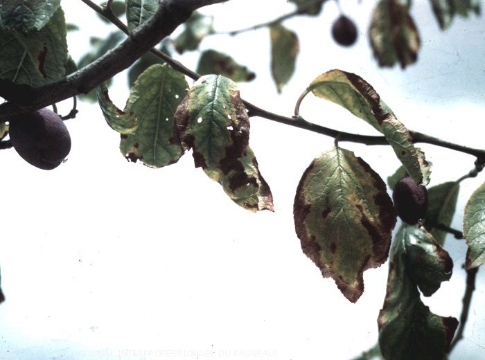 A partir du mois de juillet apparaît un dessèchement du bord de la feuille. Les plages nécrotiques gagnent vers l’intérieur du limbe entre les nervures principales, avec décoloration des zones non desséchées. Les premières feuilles atteintes, sont celles du milieu ou de la base des rameaux, les symptômes gagnent ensuite vers le haut et le bas. Les symptômes vont en se multipliant à mesure que la saison s’avance.