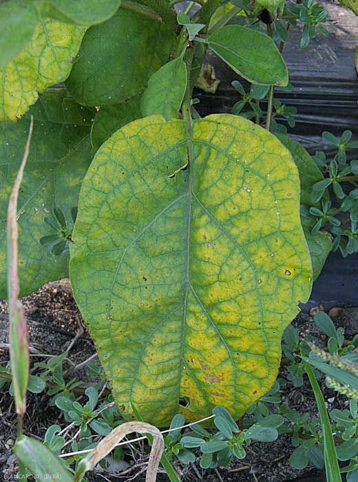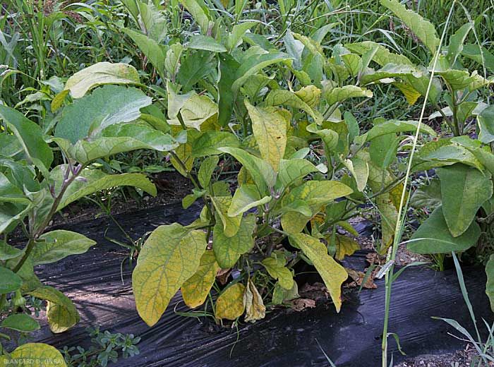 flétrissement plus ou moins rapide (figure 3), jaunissement (figures 4 à 6), voire nécrose des folioles et/ou des feuilles basses des plantes ;