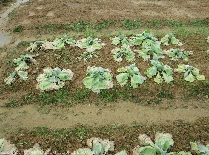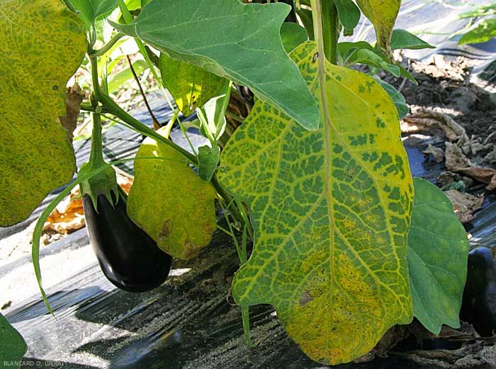 les plantes affectées se répartissent souvent sur l'ensemble de la parcelle, ou dans certaines zones ou sur certains rangs ;