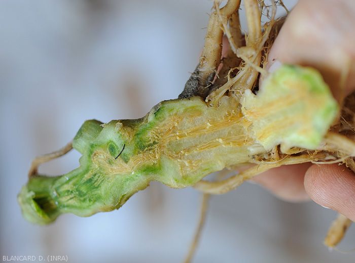 brunissement parfois plus ou moins marqué des vaisseaux localisés dans le pivot et la partie basse de la tige ( figure 2);