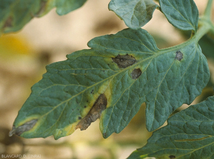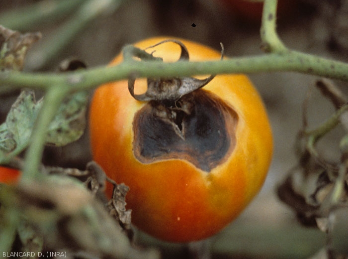 • Conditions favorables : des hygrométries élevées et des températures comprises entre 18°C et 30°C. Les rosées, de faibles précipitations continues (5 mm) ou des irrigations par aspersion suffisent à son extension. Les plantes stressées, mal fumées ou très chargées en fruits seraient plus sensibles.