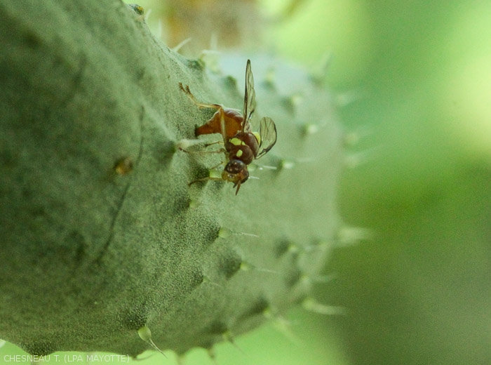 - Signes : Présence de mouches femelles sur les fruits et dans la culture (figure 6 et 7) et de larves à l'intérieur des fruits (figures 4). Des oeufs sont parfois visibles au niveau des trous de ponte (figure 3).