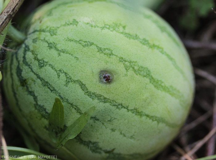 - Pourriture et décomposition des fruits liées au développement de micro-organismes opportunistes les pénétrant via les orifices de ponte (piqûres).