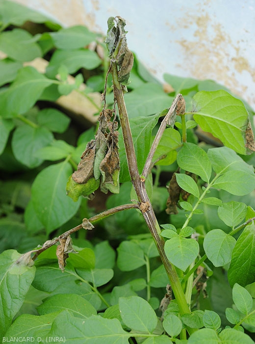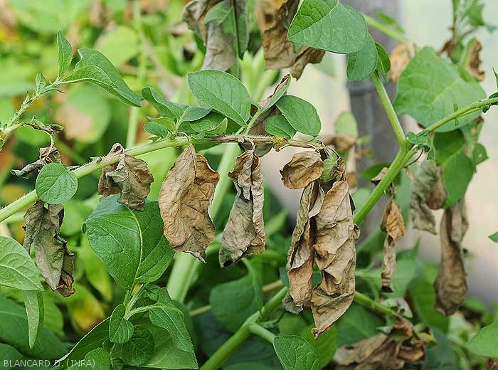 Les plantes malades sont réparties en foyers dans les parcelles ; Lorsque les conditions sont favorables, la progression des symptômes sur les plantes et dans la culture est fulgurante : des feuilles, des rameaux, voire des plantes finissent par se nécroser et se dessécher entièrement.