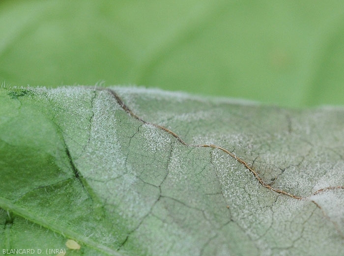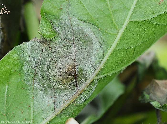 Signes: présence d'un discret et fugace duvet blancà la face inférieure du limbe (figure 7) ; celui-ci est constitué par les sporocystophores et les sporocystes de P. infestans.