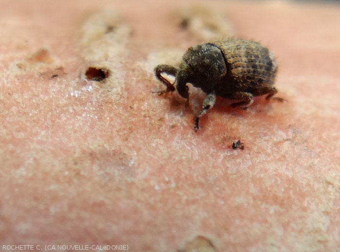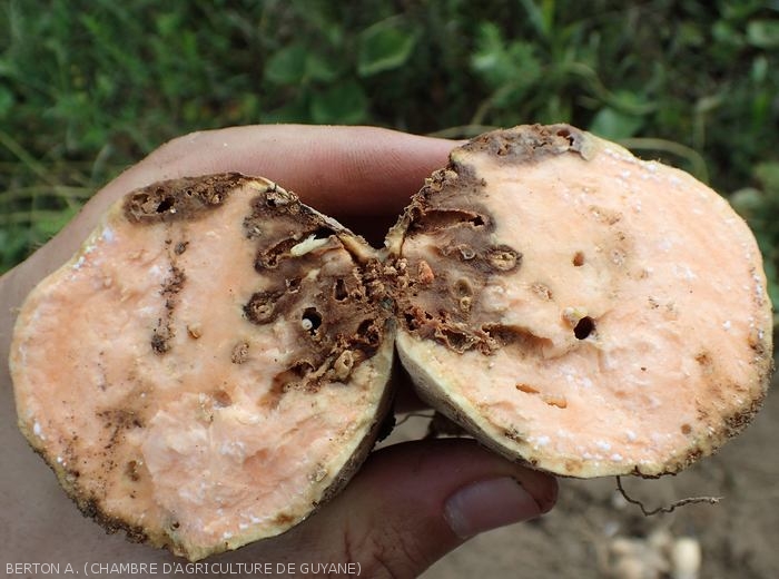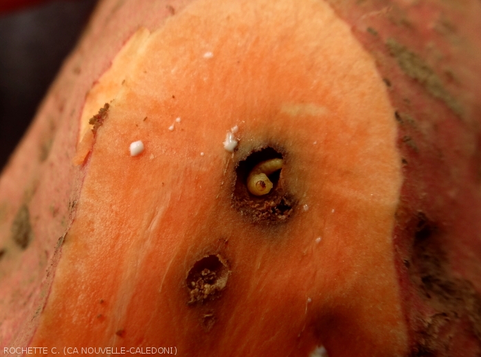 • Présence de galeries dans les tubercules des patates douces occasionnées par les larves ce qui déprécient fortement la qualité commerciale de la production. Les tubercules abimés sont ainsi beaucoup plus sensibles aux champignons et bactéries envahisseurs secondaires occasionnant des pourritures avant et après récoltes. Jusqu’à 97 % de la production peut-être perdue.