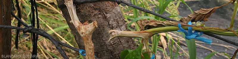 Lésions allongées sur tigess'initiant à partir de tissus sénescents ou blessés (fruits avortés, vrilles, pièces florales, feuilles sénescentes, blessures de taille et diverses...). Celles-ci peuvent être localisées à proximité du collet ou réparties sur la longueur des tiges. Elles ont une apparence humide et sombre dans un premier temps, puis se nécrosent et prennent une teinte beigeâtre et brune, et finissent par les ceinturer sur plusieurs centimètres (figures 1 à 4).