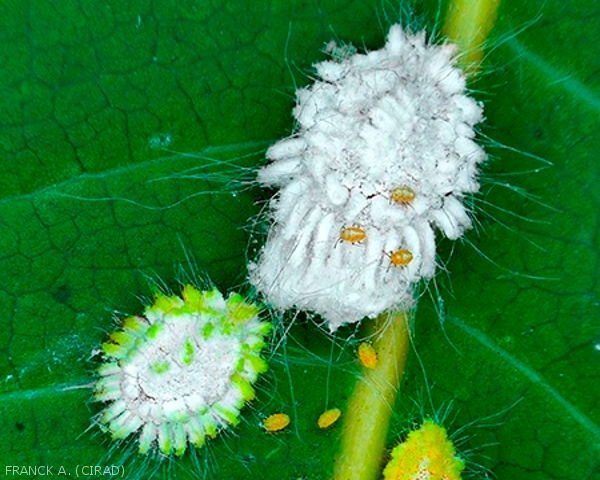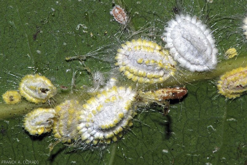 Le cycle biologique dure environ 3 mois. La femelle sécrète un ovisac dans lequel elle pond ses œufs, ils y restent pendant 2-3 jours puis émergent et les larves se dispersent. Les larves commencent alors la sécrétion d'une cire protectrice qui va recouvrir leurs corps. Après 3 mues les adultes apparaissent.