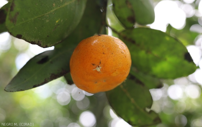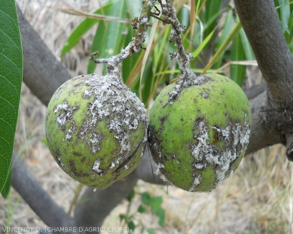 - Fumagine sur les feuilles et fruits, dépôt noirâtre ayant l'aspect de la suie.