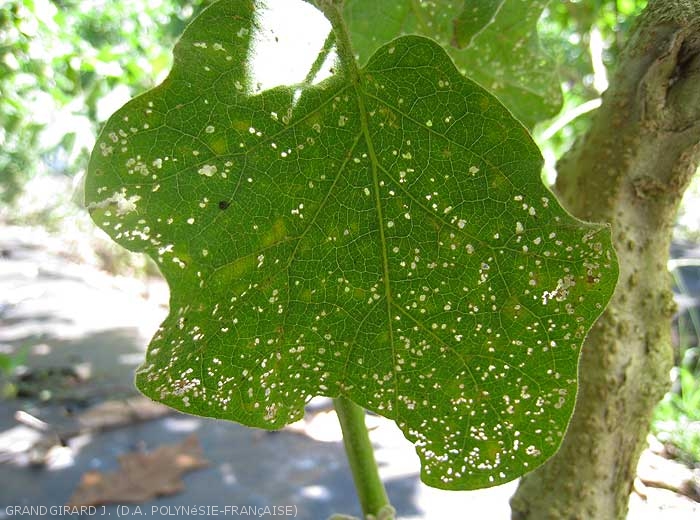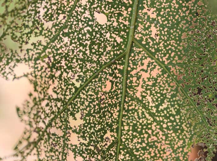 • Feuilles présentant de petites perforations du limbe régulières (quelques millimètres) et plutôt arrondies ; elles sont liées au parasitisme d'insectes adultes qui broutent et dévorent régulièrement les faces supérieure et inférieure du limbe  (figure 1 à 3, 6).