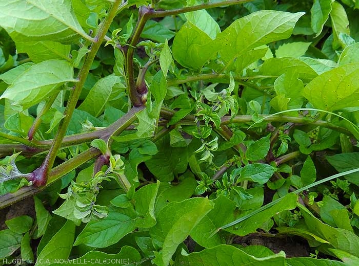 • Feuilles déformées et décolorées : plus petites, enroulées, plutôt jaunes  (figures 1 et 2), parfois  violacées (anthocyanées) aux extrémités des pousses.