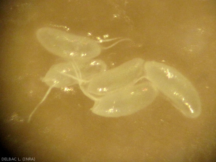 Sur des fruits très mûrs, après un début d'attaque de Drosophila suzukii, des larves de différentes espèces de drosophiles peuvent cohabiter.