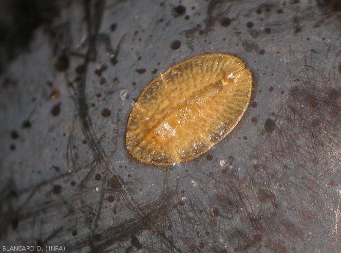 La coque de la femelle est de forme plus allongée de couleur plus foncée (figure 2), mais reste aussi collée au support lors de la ponte. Cette espèce très polyphage est présente sur tous les continents.