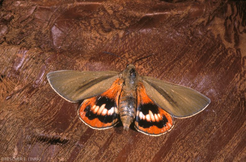 - La perforation des palmes n’est pas typique du papillon palmivore mais peut être le résultat de nombreux foreurs : la sésamie du maïs (Sesamia nonagrioides) ou la pyrale des inflorescences. La présence de sciure peut être attribuée à d’autres insectes tels que la teigne du bananier ou le charançon rouge.