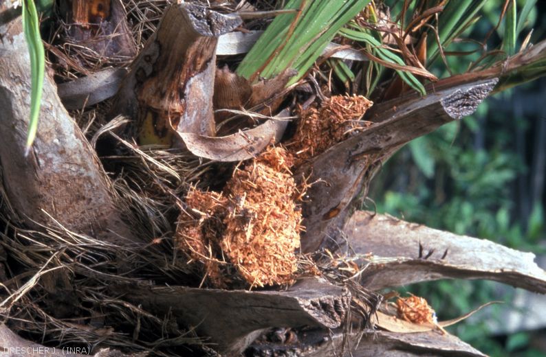 - Présence d’exuvie (en général à moitié sortie du cocon) le long du stipe et à la base des palmes