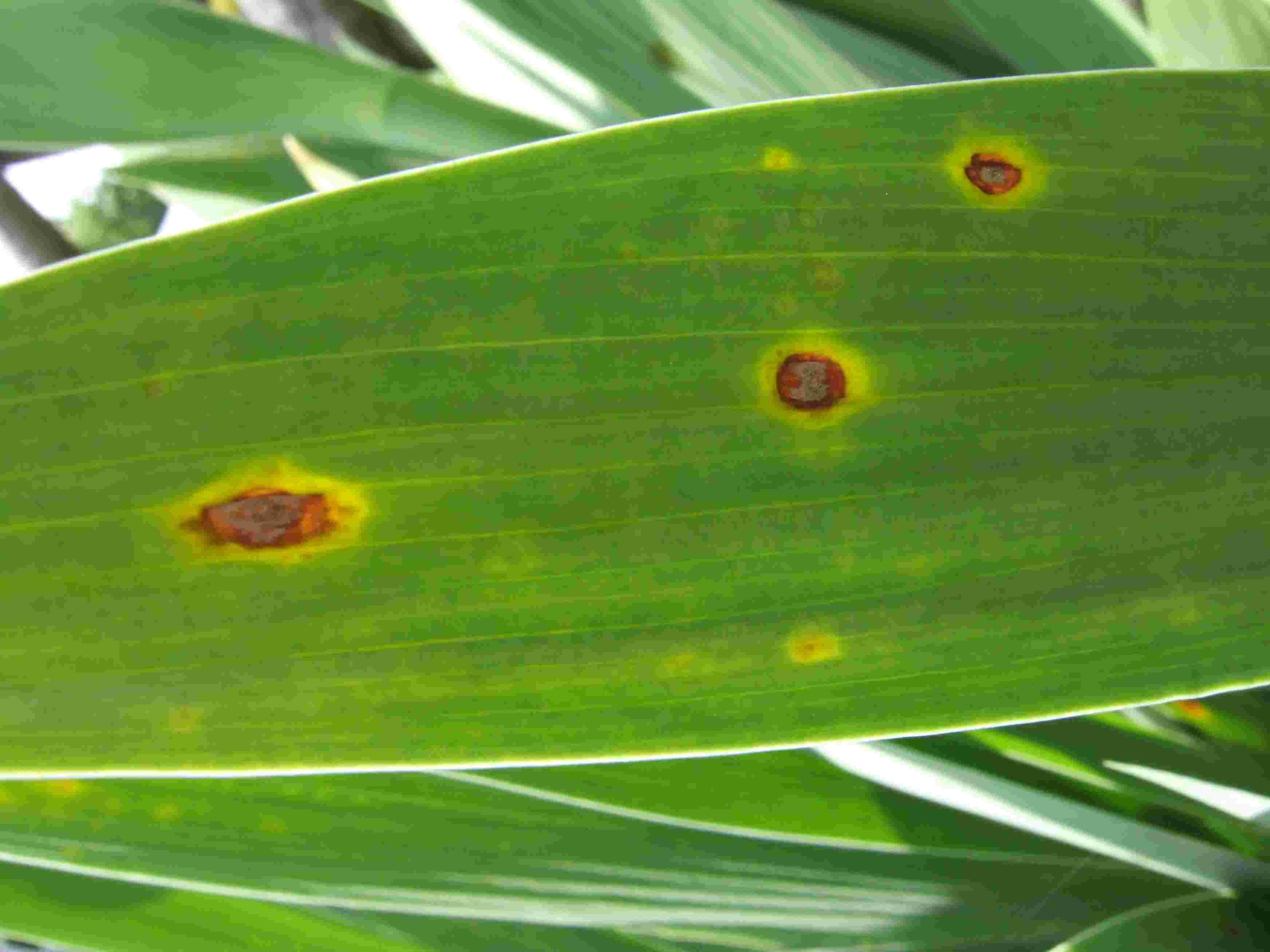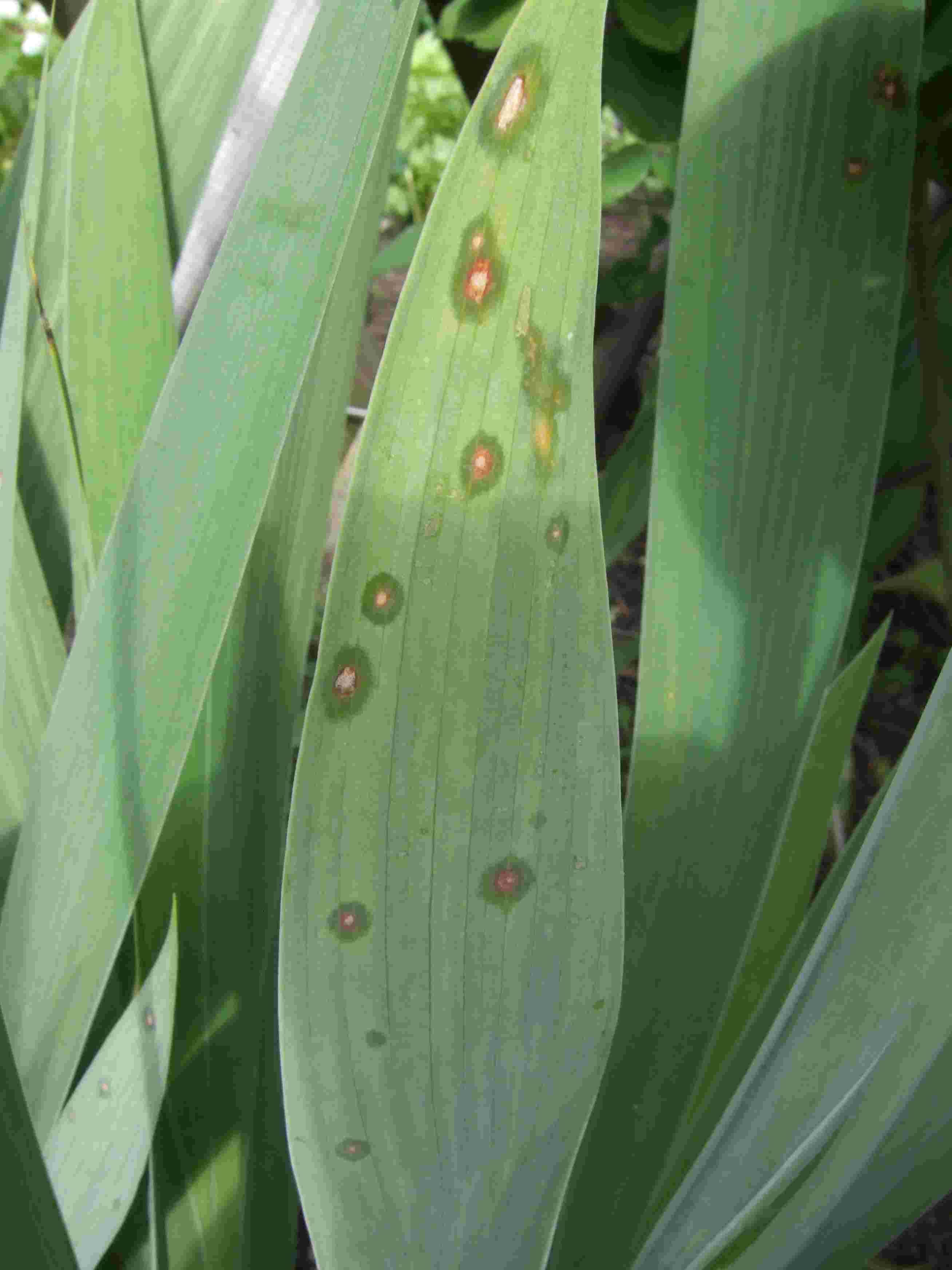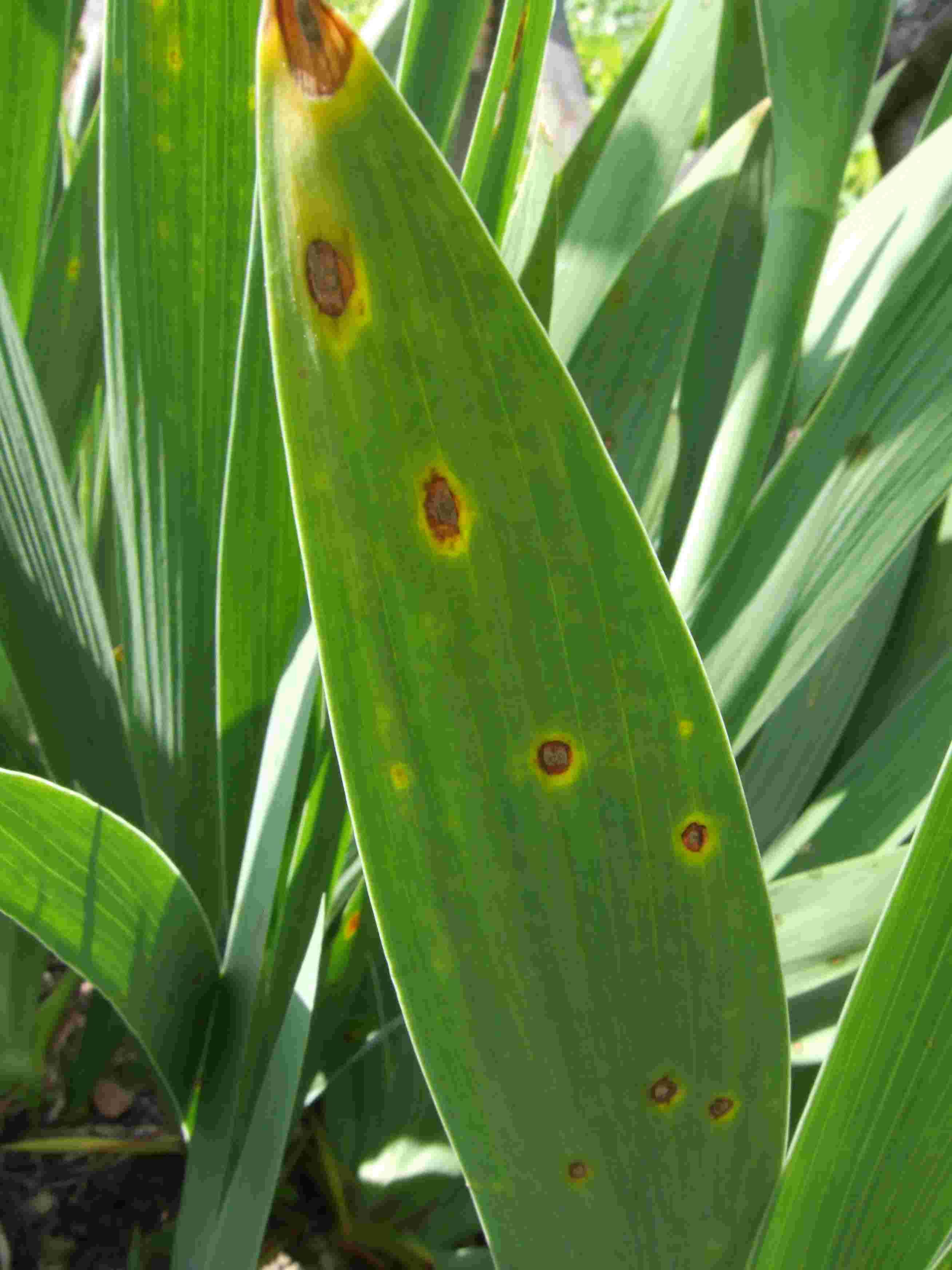 Les taches sont d’abord rondes puis ovales. Dans un premier temps d’aspect huileux, les taches sont ensuite marquées au centre de brun rouge, puis enfin bordées d’une zone claire (taches à œil). Elles apparaissent principalement sur la partie supérieure des feuilles, mais peuvent également toucher les hampes florales et les boutons. Les taches grandissent et s’accompagnent d’un dessèchement de la pointe puis de la feuille entière qui prend alors une coloration brun rouge. Le champignon n’attaque pas le rhizome ou les racines, mais après plusieurs attaques successives, cette maladie peut affaiblir la plante et diminuer la floraison.