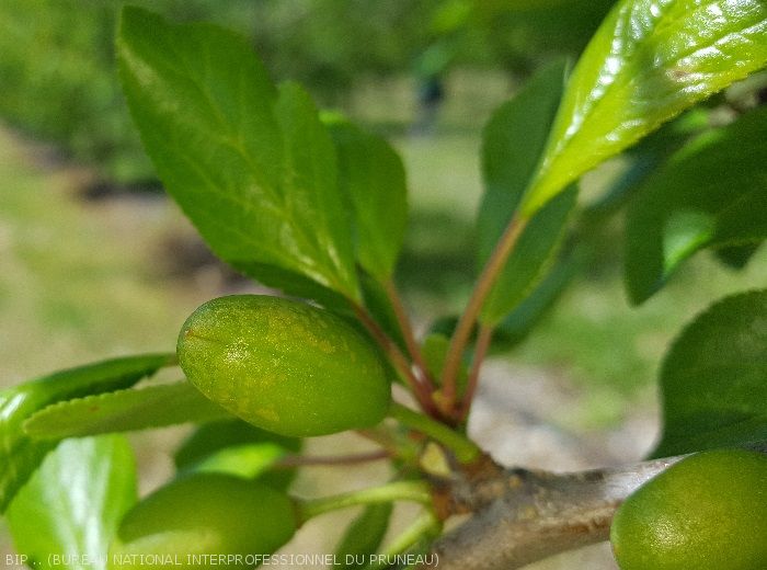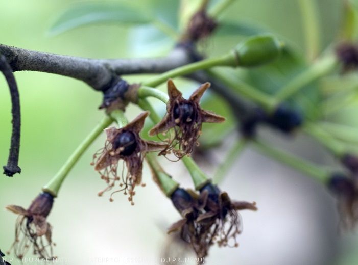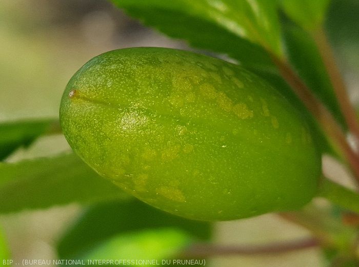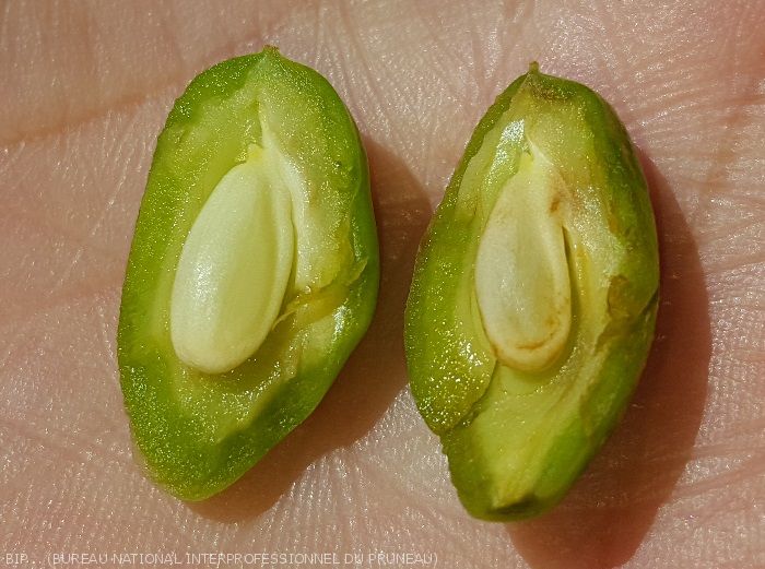 En cas de gel léger, des taches blanches (pixelisation) vont apparaître sur l'épiderme du jeune fruit. L'amande du noyau en formation change de coloration et peut présenter un brunissement. En cas de gel plus sévère, le jeune fruit noircit et chute en quelques jours.
