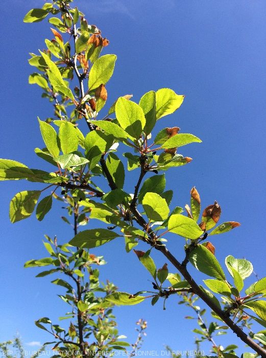 Il est rare d'observer des dégâts de gel sur le feuillage du prunier. Toutefois, en cas de gel sévère, l'extrémité des feuilles peut rougir ou brunir.