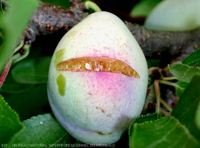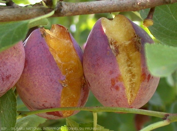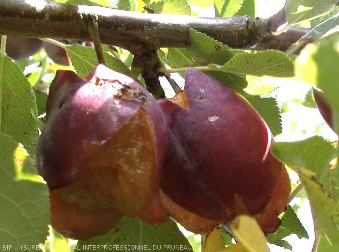 Attention, un ravageur du prunier, le puceron farineux, peut également provoquer un éclatement caractéristique des fruits. (voir fiche correspondante).