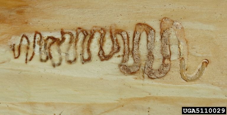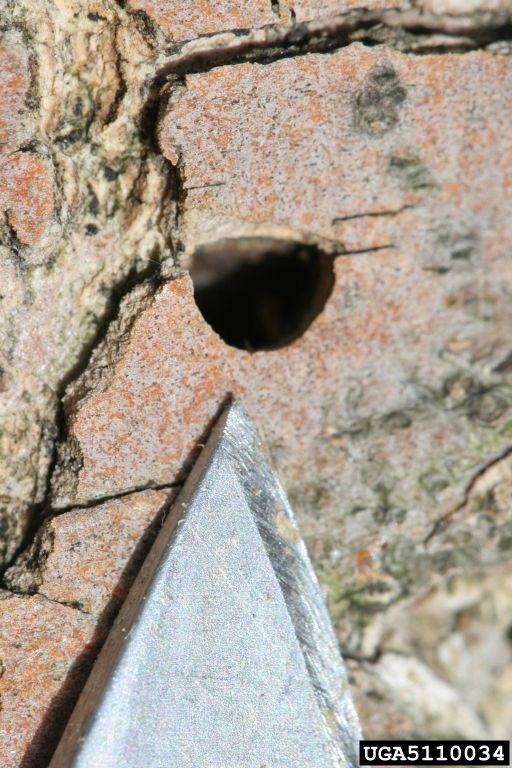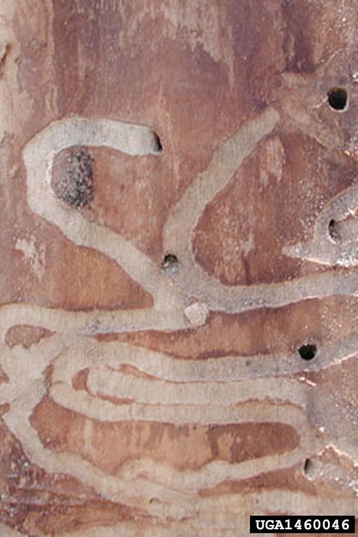 Dans le détail des trous de sortie des adultes en forme de "D" visibles sur la partie externe de l'écorce (largeur 3 à 4 mm) et la présence de longues galeries très sinueuses (serpentiformes) sous l'écorce conduisent à un diagnostic d'attaque d'agriles.