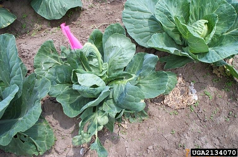 La forme larvaire cause des dégâts préférentiellement sur les jeunes plants. Les larves se nourrissent en rejetant de la salive qui digère les tissus végétaux en pleine croissance. Les feuilles s’incurvent et se boursouflent. L’inflorescence ne se forme pas, on y trouve à la place une petite protubérance, on parle alors de chou « borgne ». Les blessures provoquées par les larves favorisent le développement de bactéries ou de champignons qui entraînent la pourriture de la plante.