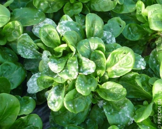 L’oïdium de la mâche prolifère lorsque les écarts de températures entre le jour et la nuit sont importants. Le champignon peut attaquer durant toute la durée de végétation de la mâche notamment lorsque les températures diurnes atteignent entre 17 et 19°C. Les attaques sont surtout visibles sur les feuilles. Des taches blanches et poudreuses s’étendent jusqu’à recouvrir toute la surface des feuilles, sur les deux faces. Les plants contaminés jaunissent, leur développement est ralenti. En cas de forte attaque, les feuilles se dessèchent et ne sont plus consommables.