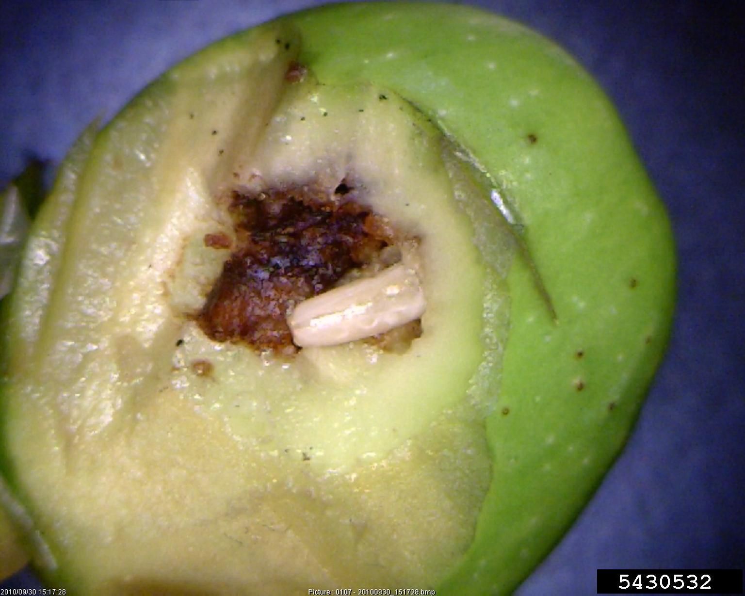 L’œuf éclot au bout de 2 à 3 jours. Le stade larvaire dure une vingtaine de jours. La larve mange d’abord la pulpe pour préparer son trou de sortie, puis recule dans le fruit pour se nymphoser. Une dizaine de jours plus tard un adulte sort de l’olive.