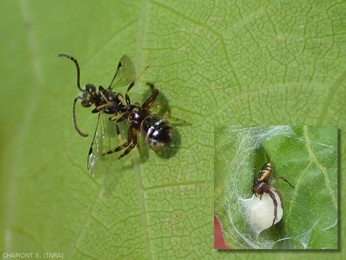 - Salticidae, ou araignées sauteuses. Famille assez facile à reconnaitre, ces araignées d'assez petite taille, sont des errantes dans la frondaison des vignes qui chassent à la vue et capturent leur proies en sautant dessus, elles ne construisent habituellement pas de toiles (photos 7 et 8). Ces araignées chassent au sol ou dans la végétation.