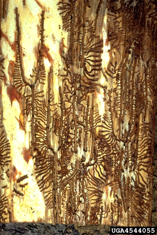 Galeries sous-corticales au niveau du tronc et des grosses branches (en phase endémique, à la base de couronne feuillée – en phase épidémique sur tout le tronc), sciure rousse. Lorsque le cycle de l’insecte est terminé, l’écorce finit par tomber.