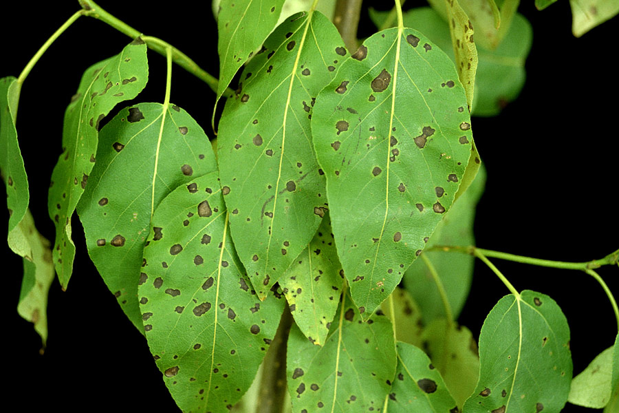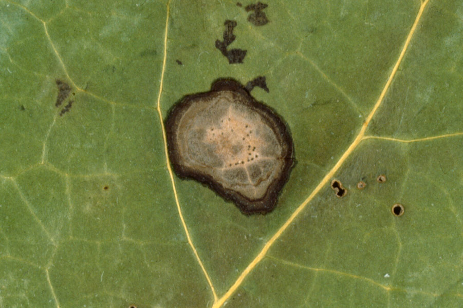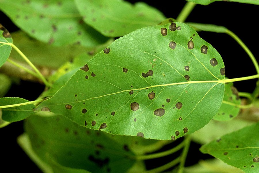 - développement de taches foliaires (1 à 15 mm de diamètre) quelques semaines après le débourrement, avec un centre de couleur claire et un pourtour de couleur foncée,