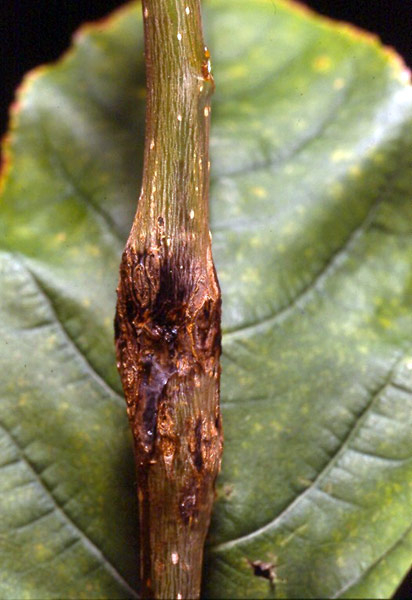 - développement de nécroses sur pousses en début d’été et de chancres sur branches et tiges,