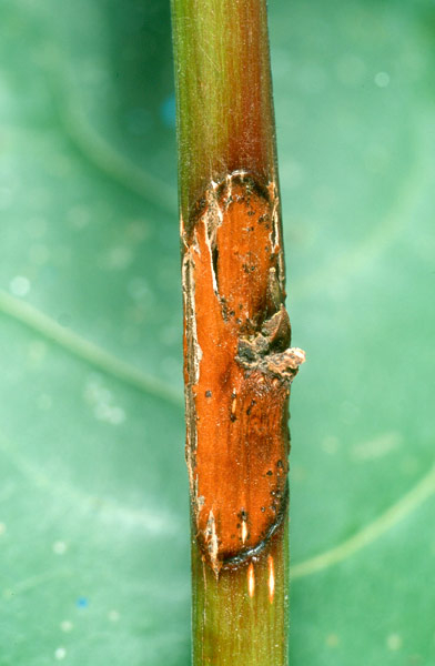 - dépression de l’écorce et déformation de la tige (chancre plat et enfoncé des deux côtés).