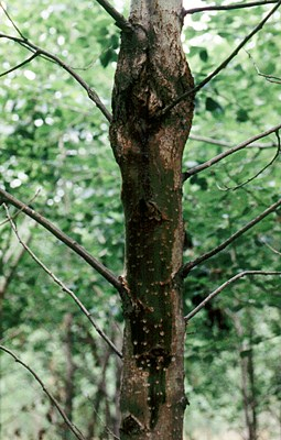 Les nécroses sur rameaux développent ensuite des chancres qui déforment le bois sur les peupliers sensibles (figure 8). Les peupliers résistants forment un bourrelet cicatriciel qui stoppe le développement du champignon.