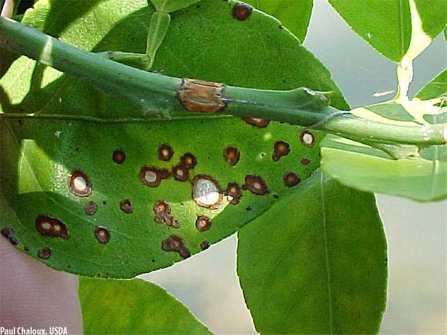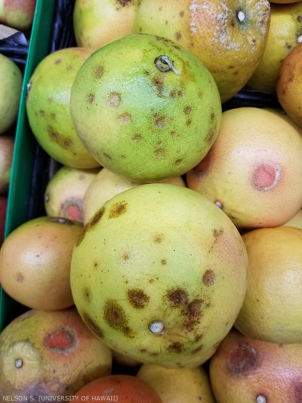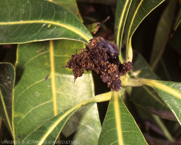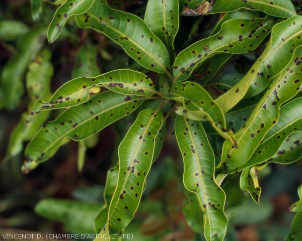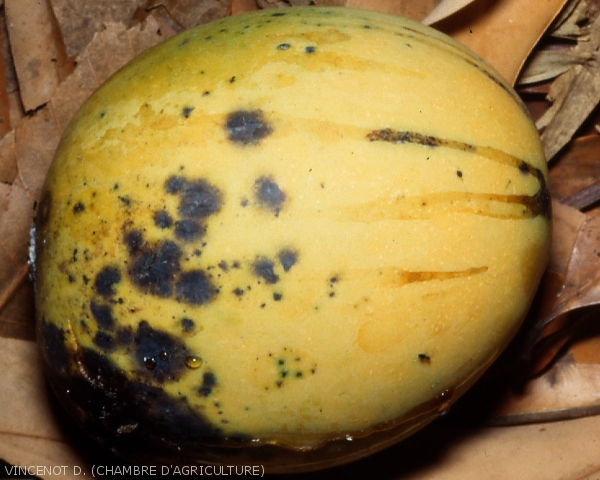 - Fruits : taches circulaires noires de plus de 5 mm de diamètre se forment à la surface de l'épiderme sous lesquelles la pulpe brunit et pourrit.