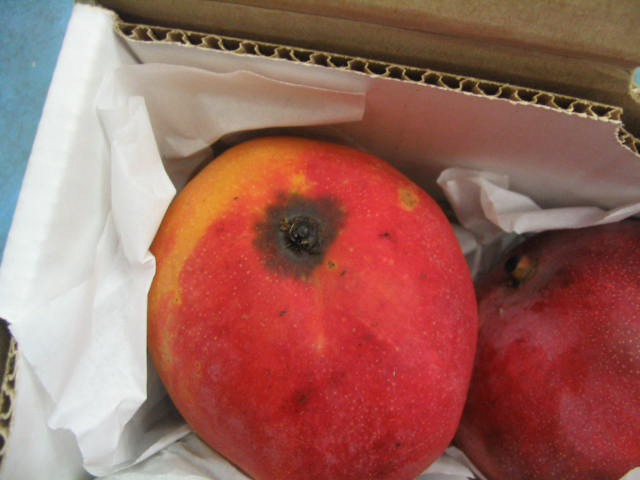 • Lésions foncées qui progressent plus lentement à partir du pédoncule, pour Phomopsis mangiferae et Pestalopsiopsis mangiferae.