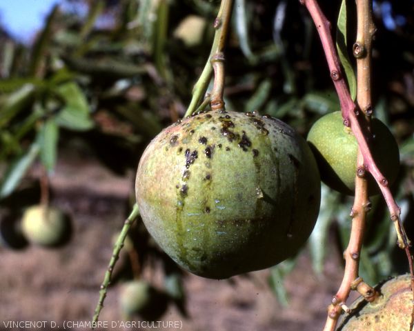 - Sur les fruits : provoque la nécrose des lenticelles et des stomates. Ces nécroses évoluent en taches noires d'où suinte une gomme chargée de bactéries. Les fruits ne sont alors plus commercialisables.