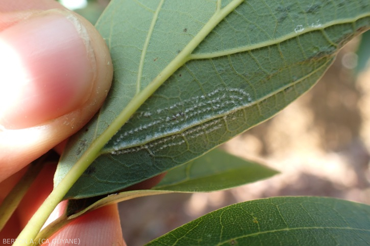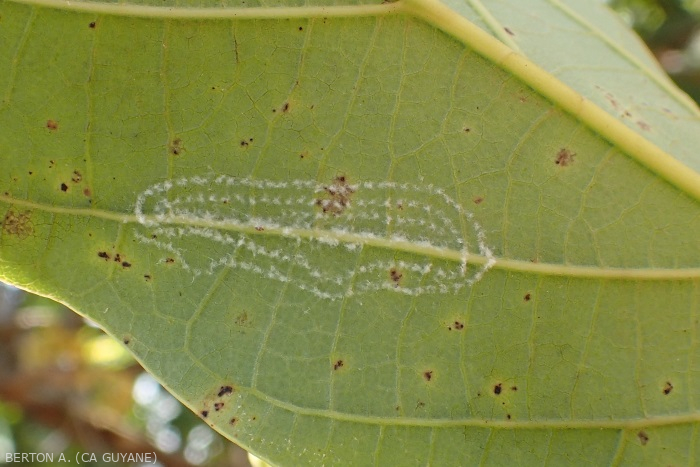 La femelle d'Aleurodicus dispersus forme des spirales lorsqu'elle pond ses œufs sur la face inférieure des feuilles ou sur les fruits.