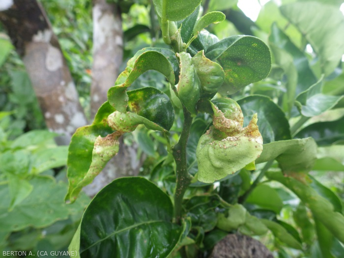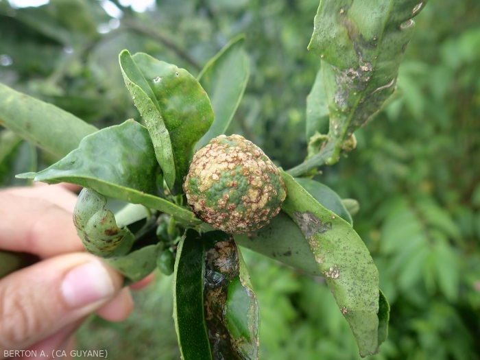 - Fruits : pustules liégeuses irrégulières (voir photo 2). Infectés aux premiers stades de leur développement, les fruits se déforment et sont sujets à une chute prématurée. Les fruits infectés ne peuvent pas être commercialisés.