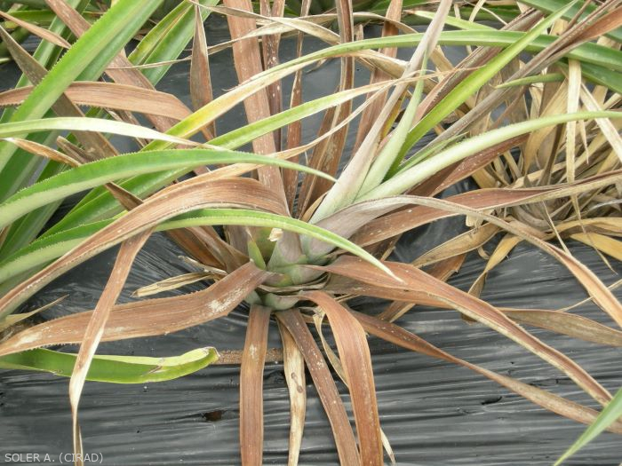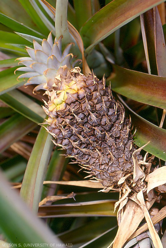 Les espèces de Phytophthora pathogènes sur l'ananas sont : Phytophthora nicotianae, Phytophthora cinnamomi et Phytophthora palmivora proche du Phytophthora parasitica. Le premier infecte plutôt les parties aériennes du plant, le second pénètre par les racines (maladie du root rot qui peut aussi être due aux Pythium spp.). Les deux causent une pourriture du cœur du plant.