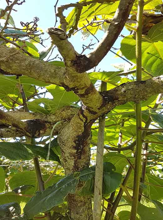Le chancre bactérien du kiwi est causé par le biovar 3 de Pseudomonas syringae pv. Actinidiae.