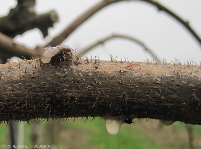 L'infection est à son apogée en termes de symptômes au début du printemps (jusqu'à la floraison) et à la fin de l'automne et serait facilitée par l'action de la taille hivernale.