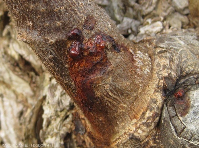 • Sur bois : formation de chancres sur les troncs et les branches avec un écoulement d’exsudat gommeux hivernal et printanier, blanc (figure 3) à brun (figure 4). Les tissus sous l’écorce peuvent également devenir bruns (figure 5). Il est important de noter que la présence d’exsudats bruns rouge n’est pas caractéristique de la bactériose liée à Psa. Des analyses sont obligatoires pour déterminer la présence ou non de la maladie lorsque ce symptôme est repéré.