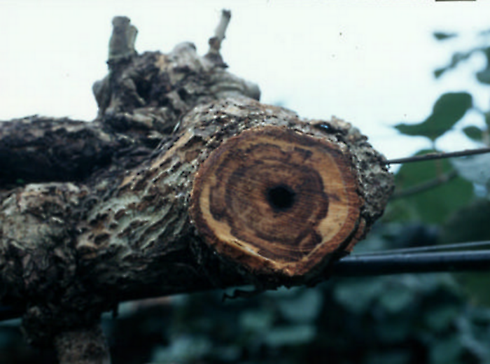 • P. aleophilum : contamine également les plaies de taille pendant la période végétative. Son infection conduirait à une nécrose des tissus.